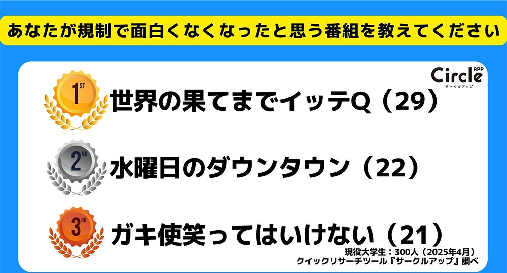 規制で面白くなくなった番組についても聞いている。1位は『世界の果てまでイッテQ』、2位は『水曜日のダウンタウン」、3位は『ガキ使笑ってはいけない』だった。具体的に規制との関係は明らかにされていないが、企画上の問題や出演者の不祥事などで元気をなくした感はある。それでもテレビが見捨てられたわけではない。