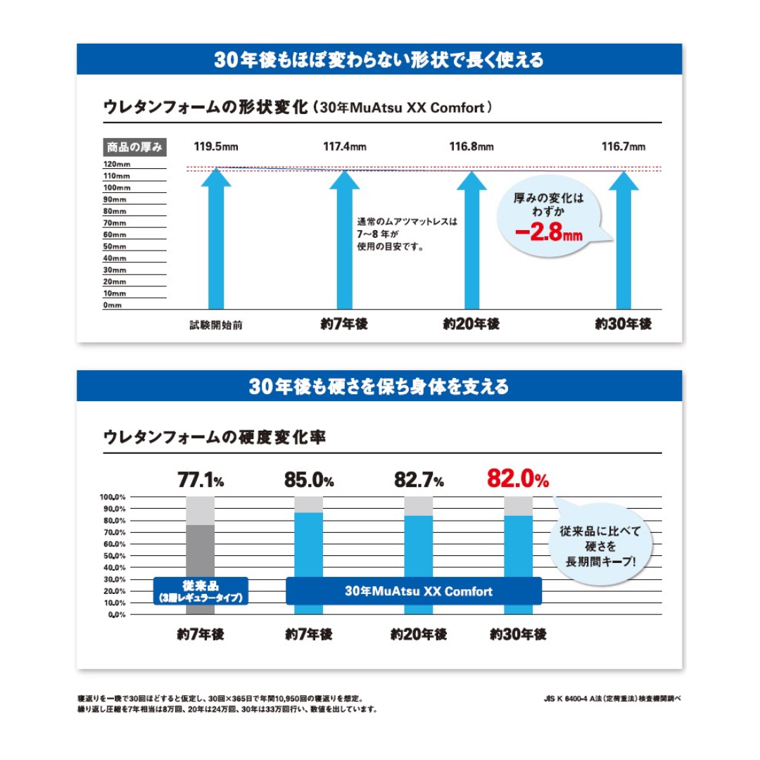 今回、同シリーズのラインアップに加わったのが、さらに快適性と耐久性を追求した最上位モデル「30年MuAtsu XX Cloud」だ。Cloud(雲)の名の通り、まるで雲に包まれるかのような寝心地が特長で、正しくメンテナンスすることで約30年も使用可能な耐久性を実現している。