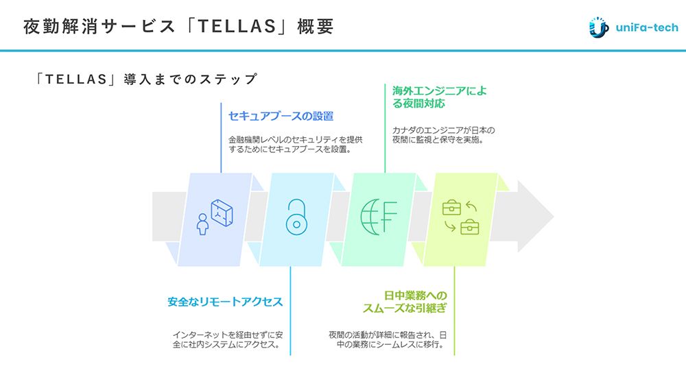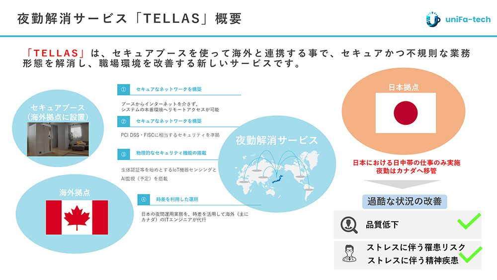 そこに希望の光をもたらしたのが、大手システムインテグレーターTISからスピンアウトし、高セキュリティワークスペースの開発と販売を行うスタートアップ、ユニファ・テックだ。同社は、運用SEの夜勤を解消するサービス「TELLAS」(テラス)の提供を開始した。簡単に言えば、カナダに第2の拠点を設け、運用SEの夜勤業務をその時間帯は昼間であるカナダのエンジニアにリモートで代行してもらうというものだ。じつに簡単な発想だが、これまでそんなサービスはなかった。技術的に困難だったからだ。