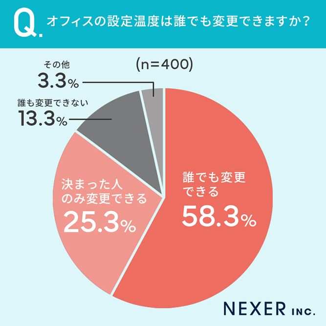 エアコンの温度は自分で変えられるかを尋ねると、誰でも自由に変えられるという回答が6割近かった。そのため約25パーセントの人は自分で温度を調整しているが、残る約35パーセントは調整できるにもかかわらず自主防衛または我慢をしているということになる。なぜかと言えば、ブランケットを使う人は「ほかの人は暑いかもしれないから」、「自分ひとりで使っているわけではないので、対策してしのげるならそうする」、「人によって耐寒温度が違うので、羽織って調整する」と他者を思いやってのことだった。我慢するという人も、「自分のわがままで変えるのは申し訳ない」と周囲を気遣っている。少数派の暑すぎるという人たちも、卓上扇風機などで他人に影響が及ばないよう個人的な対策をしていたりする。