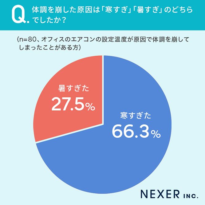 体調を崩した人に、暑すぎたのか寒すぎたのか、どちらかと尋ねると、「寒すぎた」が7割近い。「寒くて頭痛を起こしました」、「風が当たりすぎておかしくなった」など、エアコンの温度や風による「被害」を訴える人は女性だけでなく男性にもいる。