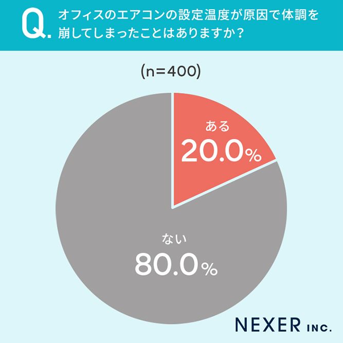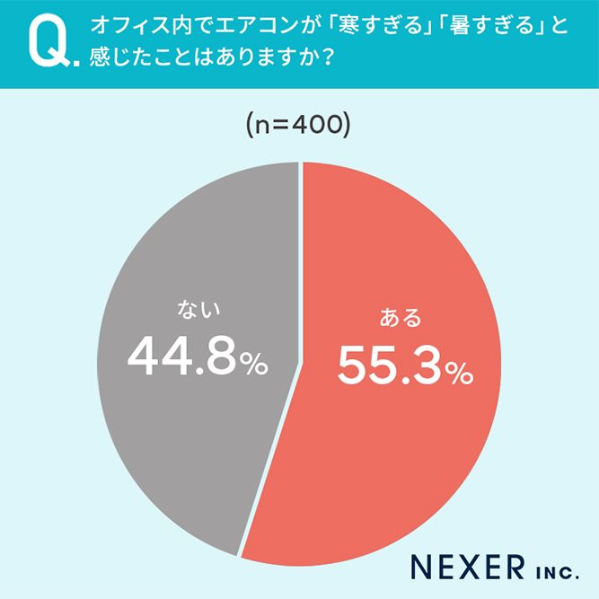 インターネットリサーチ事業などを展開するNEXER(ネクサー)は、業務用エアコンの販売施工などを行うエアコンフロンティアと共同で、現在会社に勤めている男女400人を対象に「オフィス内のエアコン設定温度に関するアンケート」を実施した。それによると、オフィスでのエアコンが「寒すぎる」または「暑すぎる」と感じたことのある人は約6割に達した。