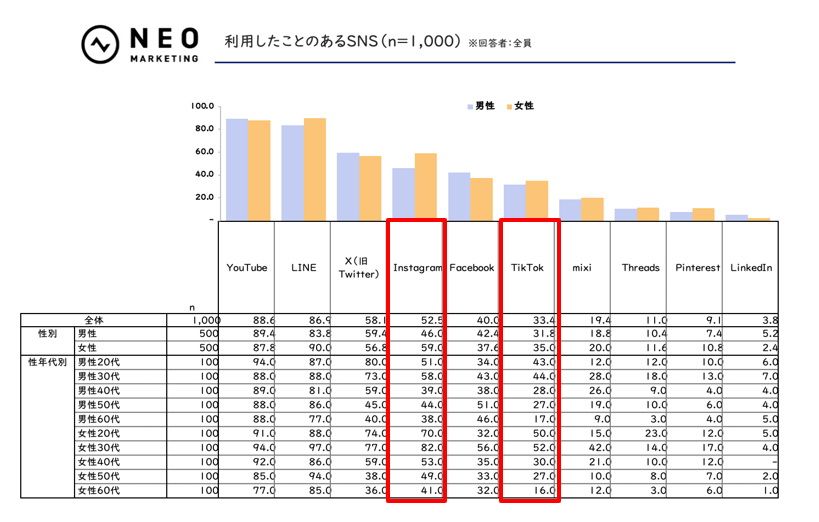 利用率を細かく見ていくと、「Instagram」は女性、特に20~30代に人気で、これは「TikToK」でも同様の傾向だ。一方、「Facebook」は30代の女性は多いものの、全体としては40~50代の男性からの支持を得ている。また、Metaの「Threads」は、Instagramとの連携で世界的には急速に伸びているものの、日本では現状「mixi」にも及んでいない。