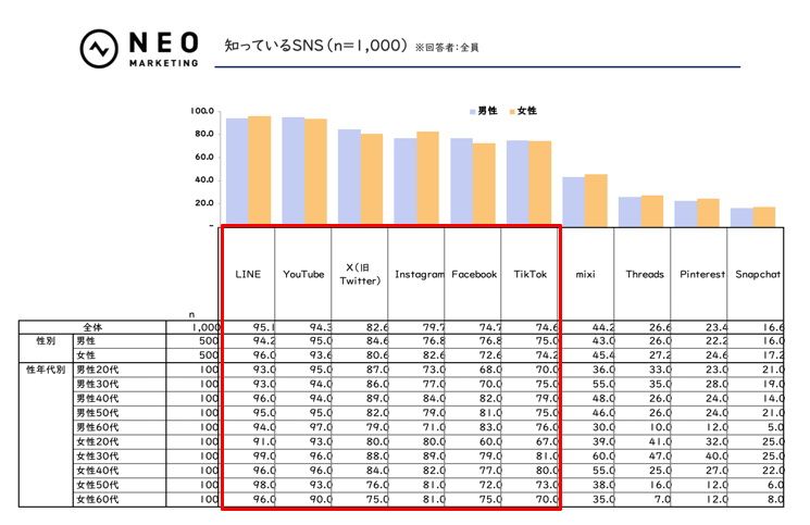 それによると、知っているSNSとしては、「LINE」が95.1%でトップ、僅差で「YouTube」の94.3%、ちょっと離れて「X」の82.6%と続いている。この上位3つのサービスは、男女問わず、ほぼまんべんなく認知されている印象だ。
