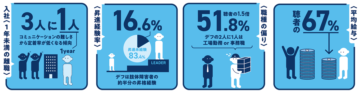 ろう難聴者は、会議や雑談の内容がわからないまま過ごしてしまうことがあり、会話に加われないことで「空気が読めない人」と誤解されたり、偶発的な雑談から生まれるチームの一体感やアイデア交換から疎外されるなどの困難があり、入社1年未満の離職する割合が3人に1人、昇進経験者の割合が16.6パーセント(肢体障がい者の約半分)、職種に偏りがあり平均給与は耳が聞こえる人の67パーセントと明確な格差があるという。