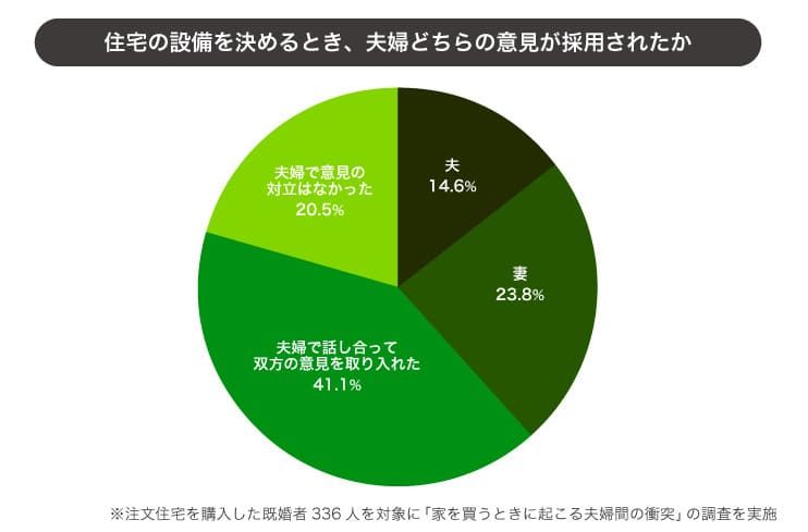 一方で「設備選び」に関しては、妻の意見が23.8%、夫の意見は14.6%にとどまり、キッチン、壁紙、フローリング素材など、生活に密接に関わる部分では妻のこだわりが反映されやすいようだ。夫婦間での「家づくり」というプロジェクトが「理性」と「感性」、「投資」と「暮らしやすさ」のせめぎ合いの中で決定されていくという構図が見えてくる。