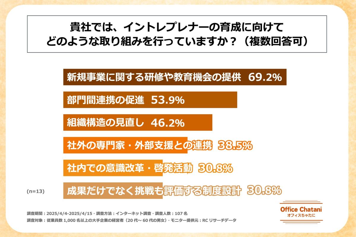 昨今「成果主義」という言葉を良く耳にしますが、回答の6番目に「成果だけでなく挑戦も評価する制度設計」とあります。既に立ち上がった事業を成長させることも容易ではないものの、まだ立ち上がっていない事業を新たに立ち上げ、成功させることは遥かに難しいと私自身の経験からも感じています。制度で吸収できる課題なのか否かは、判断が難しい問題であるのは間違いないですが、既存の事業を継続する仕事をしていた方が有利に働く仕組みは改善される必要があるとみています。