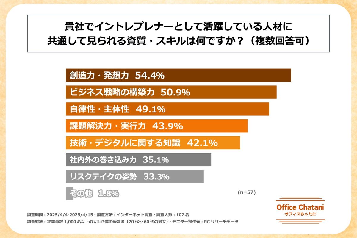 イントレプレナーに必要なスキルとして最も多く挙がったのが「創造力・発想力」でした。加えて、「自律性・主体性」、「社内外の巻き込み力」といった大企業の中で新しい流れをおこすための力が求められています。