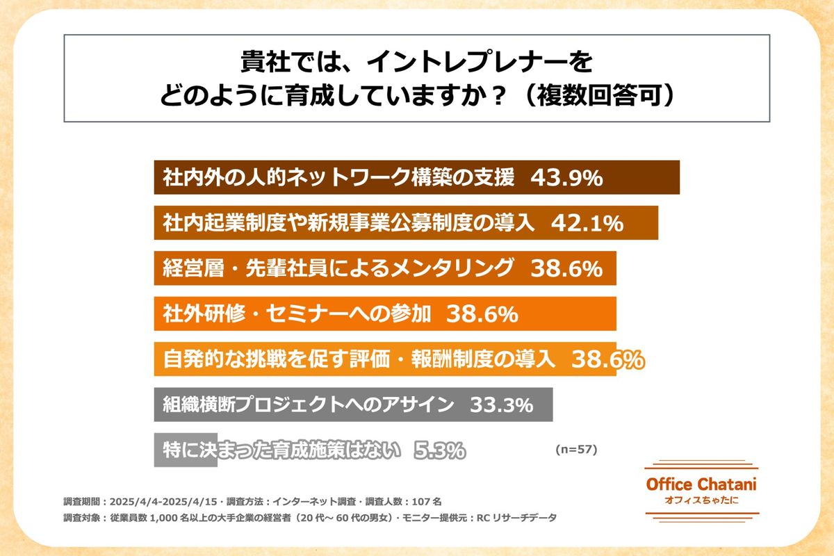実際、調査によれば、「社内外の人的ネットワーク構築の支援」が育成方法の1位となりました。「組織横断のプロジェクトへのアサイン」といった他分野・多分野に触れる機会も多くの企業が取り入れていることがわかります。社内大学を創設したり、長期にわたる育成プログラムを開始するといった企業もあるものの、実地で新規事業の創造に関われる機会が重要であるのは間違いなく、少なくない企業で長期にわたって事業のポートフォリオに大きな変化がない事から内部人材への新規事業経験を提供することが難しくなっているかもしれません。