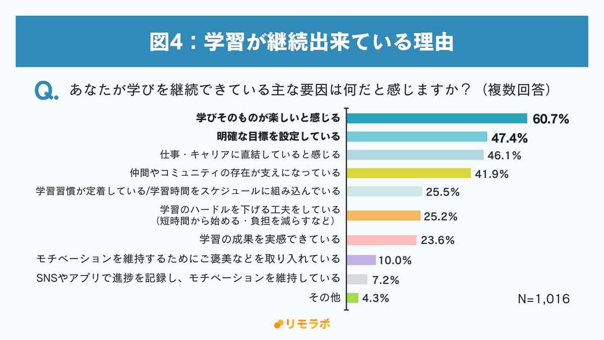 現在も学びを続けられている理由としてもっとも多かったのは、「楽しいと感じるから」。次いで「目標を設定している」、「仕事やキャリアに直結している」が続いた。