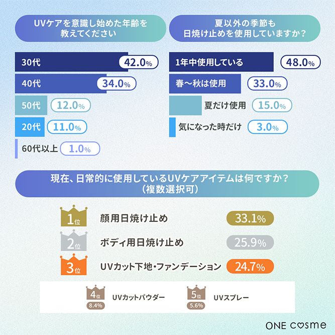 コスメスキンケアプラットフォーム「ONEcosme」は、20代から60代の女性100人を対象に「紫外線ケア」に関するアンケート調査を実施した。それによると、日焼け止めを1年中使っているという人がほぼ5割、顔用と身体用を使い分ける人が6割以上と紫外線対策の意識が全般的に高いことがわかる。