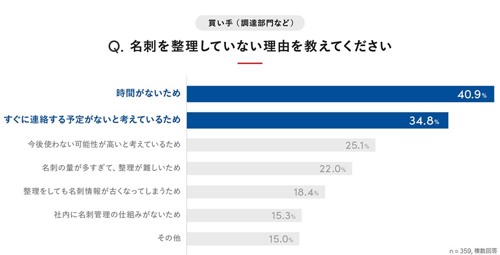 名刺を整理しない理由のトップは「時間がない」(約40パーセント)だった。続いて「すぐに連絡する予定がない」も約35パーセントと多い。