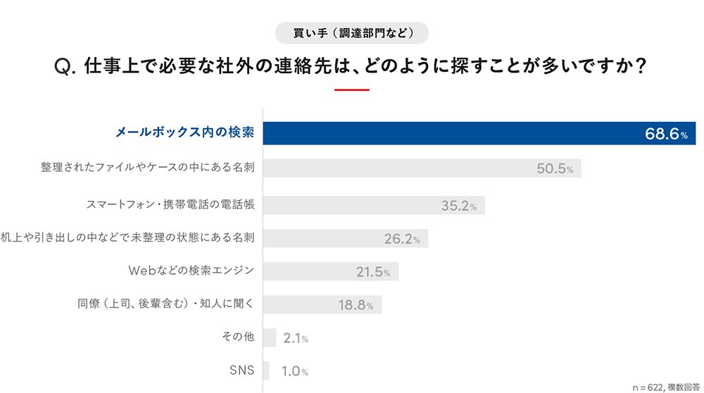 営業DXサービスなどを展開するSansan(サンサン)は、名刺管理サービスを導入していない購買部門などの買い手側の会社員622人、営業部門などの売り手側の会社員650人を対象に「名刺交換後の営業・購買活動の実態調査」を実施した。