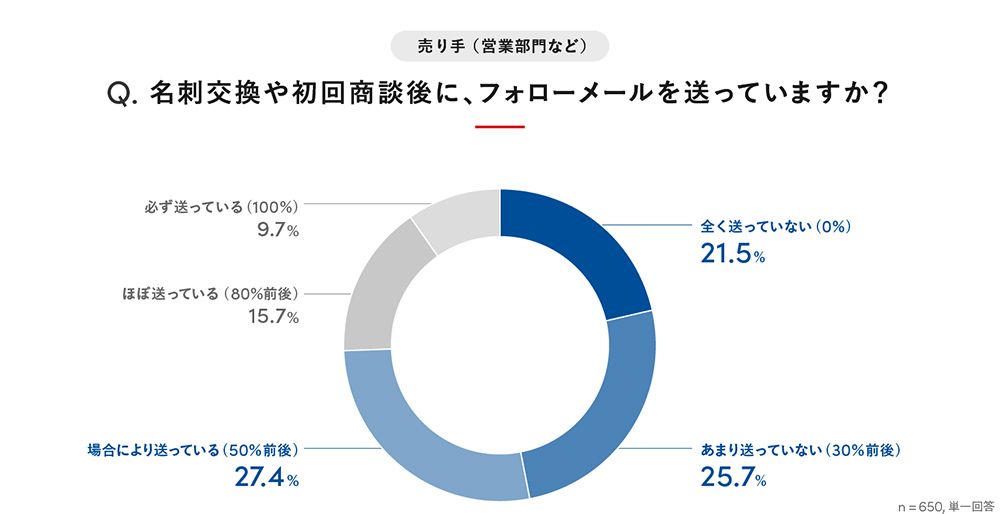 ところが、売り手でフォローメールをかならず送るという人は10パーセントに満たない。まったく送らない、あまり送らないはあわせて約47パーセントにのぼる。せっかくもらった名刺を活かしきれていないということだ。名刺交換は単なる「儀式」と化してしまったのか。