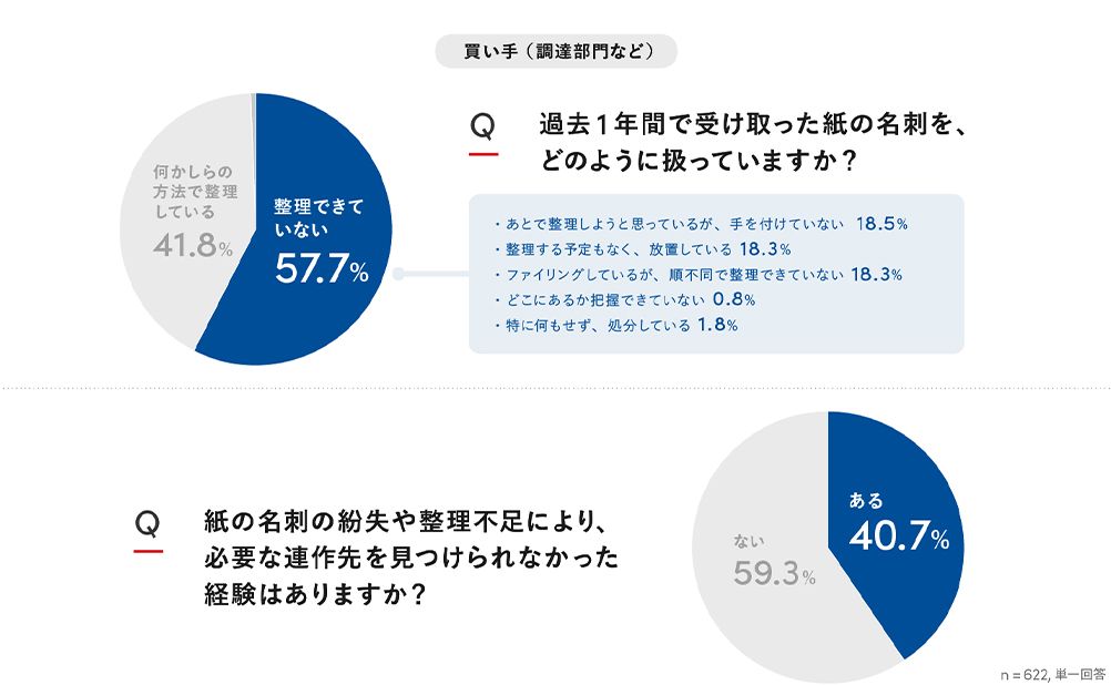 それによると、名刺を受け取った買い手で、過去1年間に受け取った紙の名刺を何かしら整理できている人は約42パーセント、できていない人が約58パーセントとなった。また、紙の名刺が未整理だったり紛失したりして必要な連絡先がわからなくなった経験のある人は約40パーセントにのぼった。