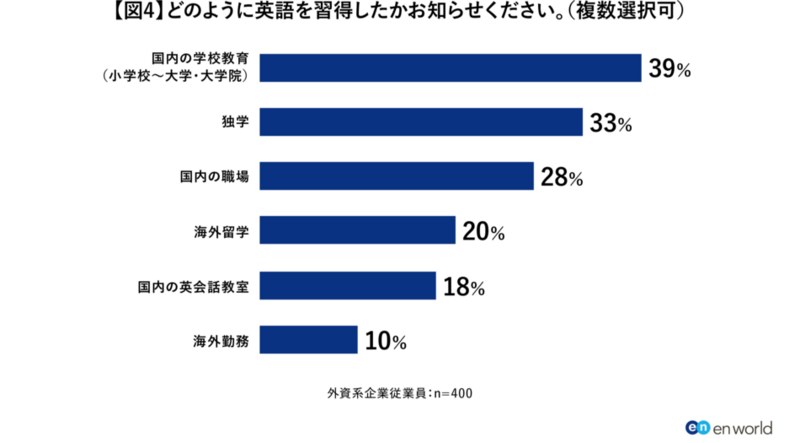 さらに、「英語の習得方法」について質問したところ、「国内の学校教育(小学校~大学・大学院)」(39%)、「独学」(33%)、「国内の職場」(28%)が上位を占める結果に。「国内の学校教育(小学校~大学・大学院)」で習得した人は「海外留学」(20%)で習得した人よりも2倍近く上回っていることがわかりました。【図4】