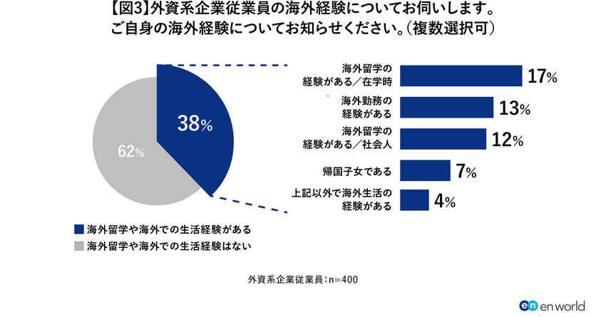 外資系企業の従業員に「海外経験」について質問したところ、外資系企業で働く従業員の62%が「海外留学や海外での生活経験はない」と回答していることが明らかとなりました。【図3】