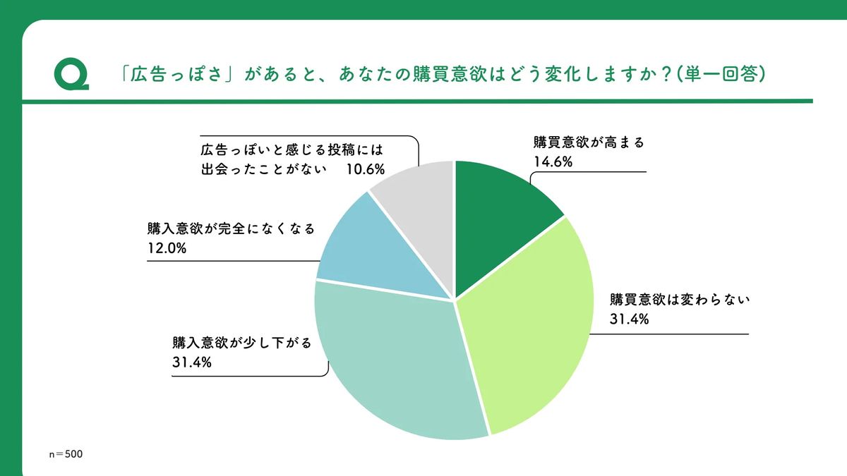 では、どのような広告がZ世代に響いているのだろうか。「広告っぽさ」のある投稿で購買意欲はどう変化するかの問いに、「購買意欲が高まる」は14.6%とわずか。むしろ「購買意欲が少し下がる」「購買意欲が完全になくなる」を合わせると、43.4%に達し、「いかにも広告」という押し付けがましい表現の広告は避けられる傾向にあるようだ。