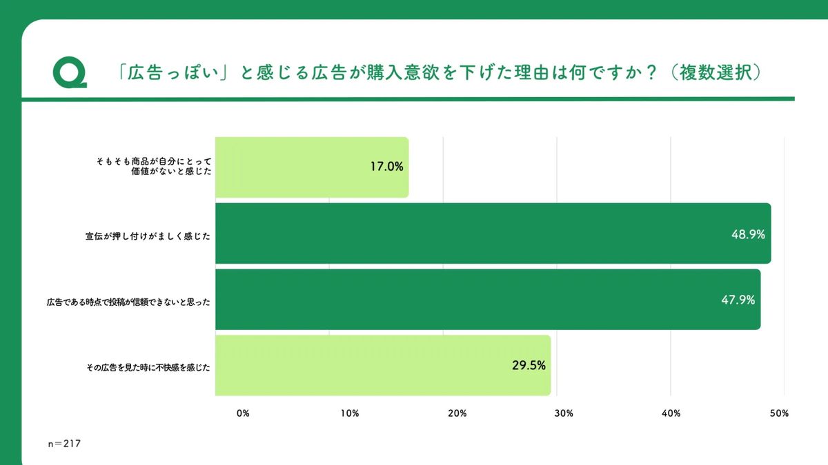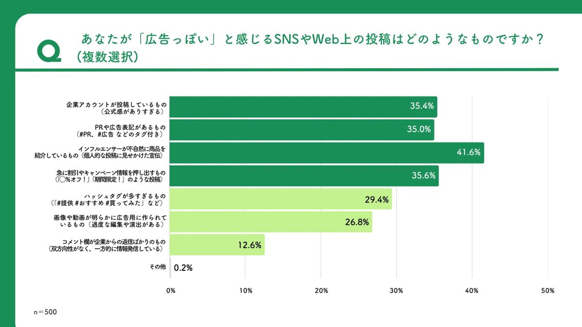 意欲を削ぐ理由としては、「宣伝が押し付けがましく感じた」が48.9%、「広告である時点で信頼できない」が47.9%とほぼ半数を占めた。ではどういう投稿がそう感じるのかの問には、「インフルエンサーが不自然に商品を紹介しているもの」が41.6%でトップだった。SNS広告では、インフルエンサーを使う傾向にある印象だが、見せ方次第では逆効果ということになる。