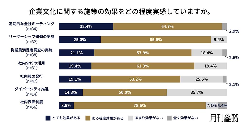 やはり企業文化は重要であり、それがよい影響力を発揮するようアップデートすることが大切だ。実際に企業文化のアップデートに注力している企業が効果ありと感じる施策のトップが、定期的な全社ミーティングだった。続いてリーダーシップ研修、社内SNSの活用などとなっている。