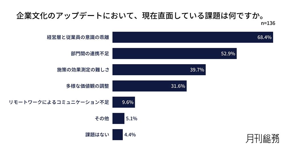 また、企業文化のアップデートで障害になるものを尋ねると、もっとも多かったのが経営層と従業員の意識の乖離で、部門間の連絡不足がそれに続く。