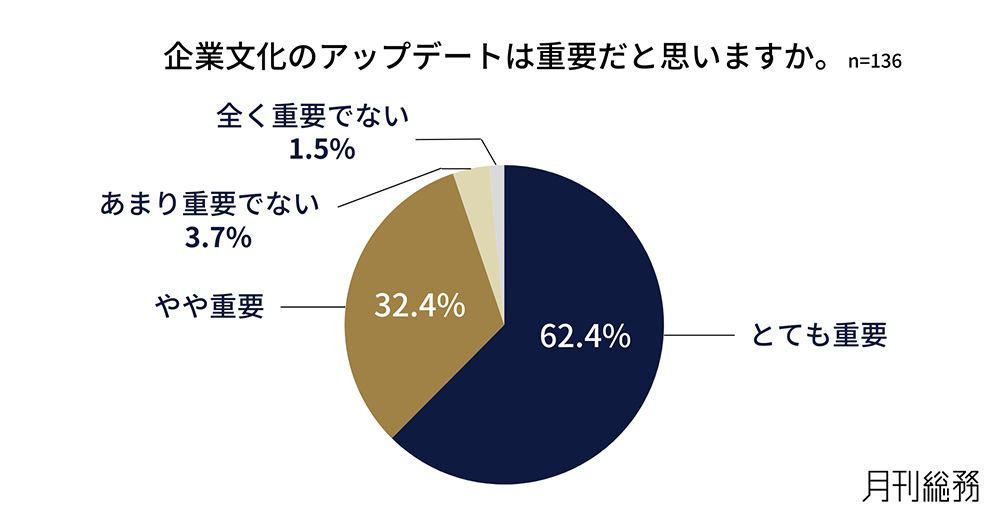 日本で唯一の総務専門誌『月刊総務』を発行する月刊総務は、全国の企業に勤める人を対象に企業文化に関するアンケート調査を行い136人から回答を得た。それによると、ほぼ9割の人が企業文化の重要性を認識していることがわかった。