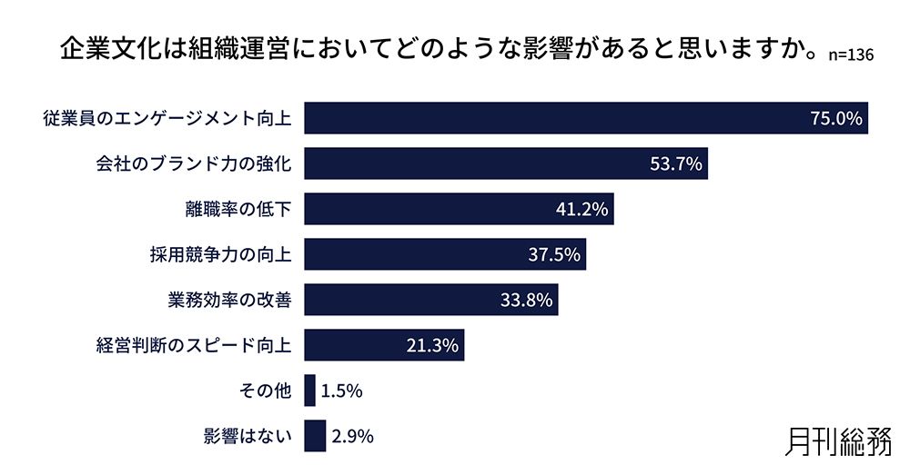 企業文化が組織運営に与える影響を聞くと、75パーセントという圧倒的多数が従業員のエンゲージメント向上だと答えた。それに、会社のブランド力の強化、離職率の低下、採用競争力の向上などが続いている。