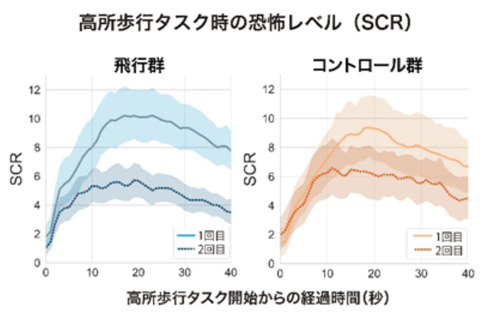 その結果、2回目の高所歩行タスクでは、コントロール群に比べて飛行群の恐怖レベルがSCR、SFSともに大きく下がっていた。同じ実験を別の参加者で2回行ったが、いずれも飛行群の恐怖度レベルが明らかに減少した。