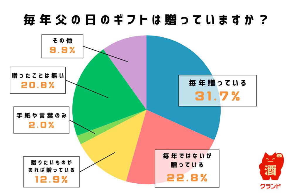 オンライン酒屋クランドは、同社のメールマガジン会員、公式SNSのフォロワーを対象に父の日に関するアンケート調査を行ったところ(回答数101)、父の日に毎年贈り物をしているという人が約3割、ときどき贈る人が4割弱となった。合わせて約7割。意外に高い割合だ。