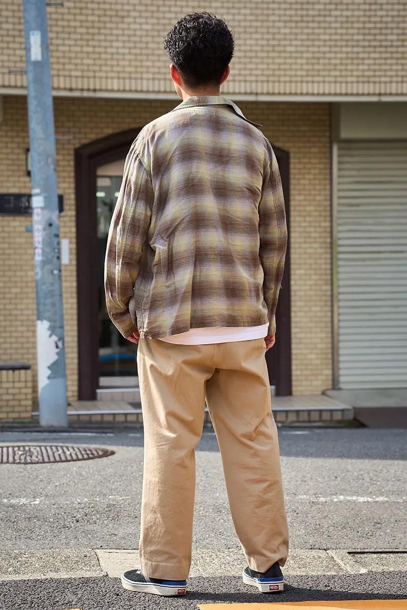 格子柄とユニークな染め柄が共演した、亜流マドラスチェックとも表現すべきシャツが主役。いい具合に肩が落ちたシルエットで、モダンなリラックス感を伝える。