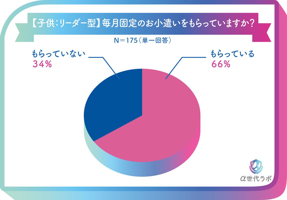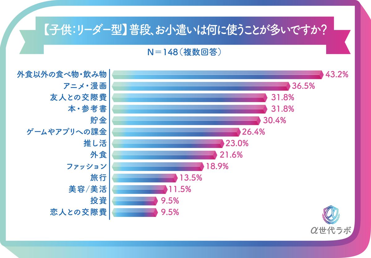 α世代のお小遣い事情としては、リーダー型は「もらっている」が66%と3人に2人がもらっているが、フォロー型は48%と2人1人と割合が少ない。使い方としては、いずれも「外食以外の食べ物・飲み物」がトップだが、リーダー型は「アニメ・漫画」「本・参考書」が上位に入り、フォロー型は「友人との交際費」「貯金」が上位に入っており、このあたりも意識の違いが若干見られた。