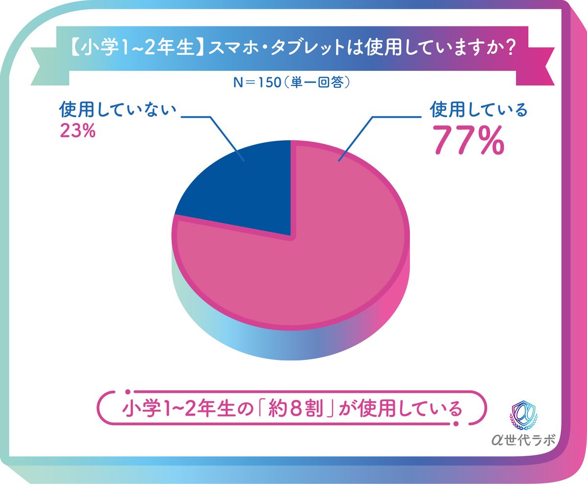 小学1~2年生でスマホ・タブレットを使用しているかについては、77%の人が「使用している」と回答。「使用していない」というほうが圧倒的に少数派となっている。