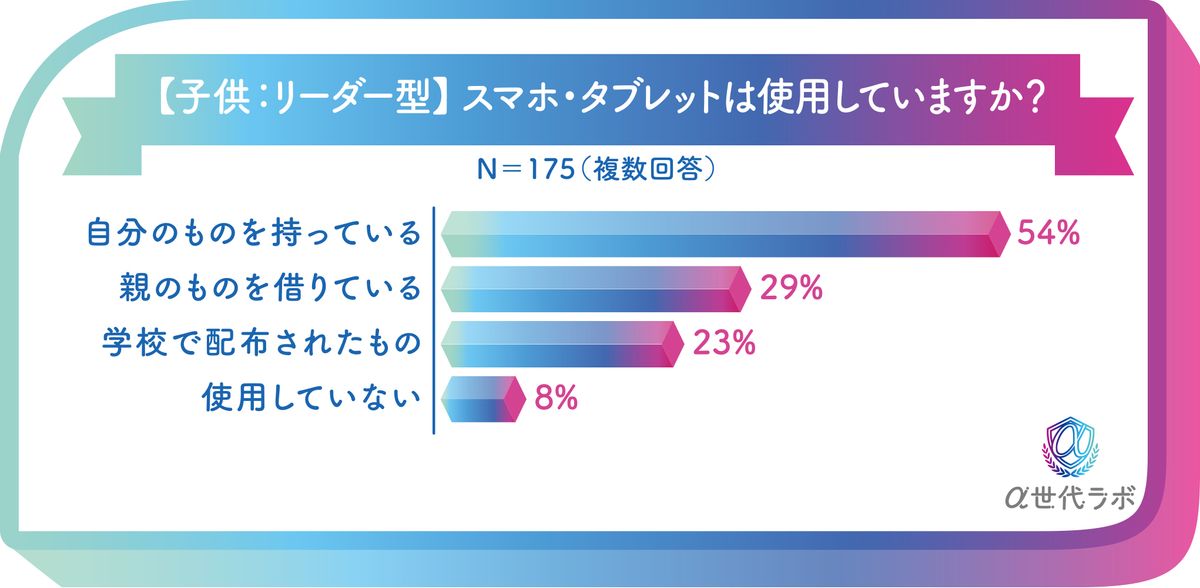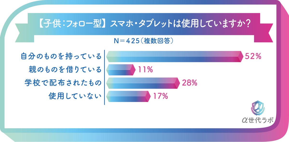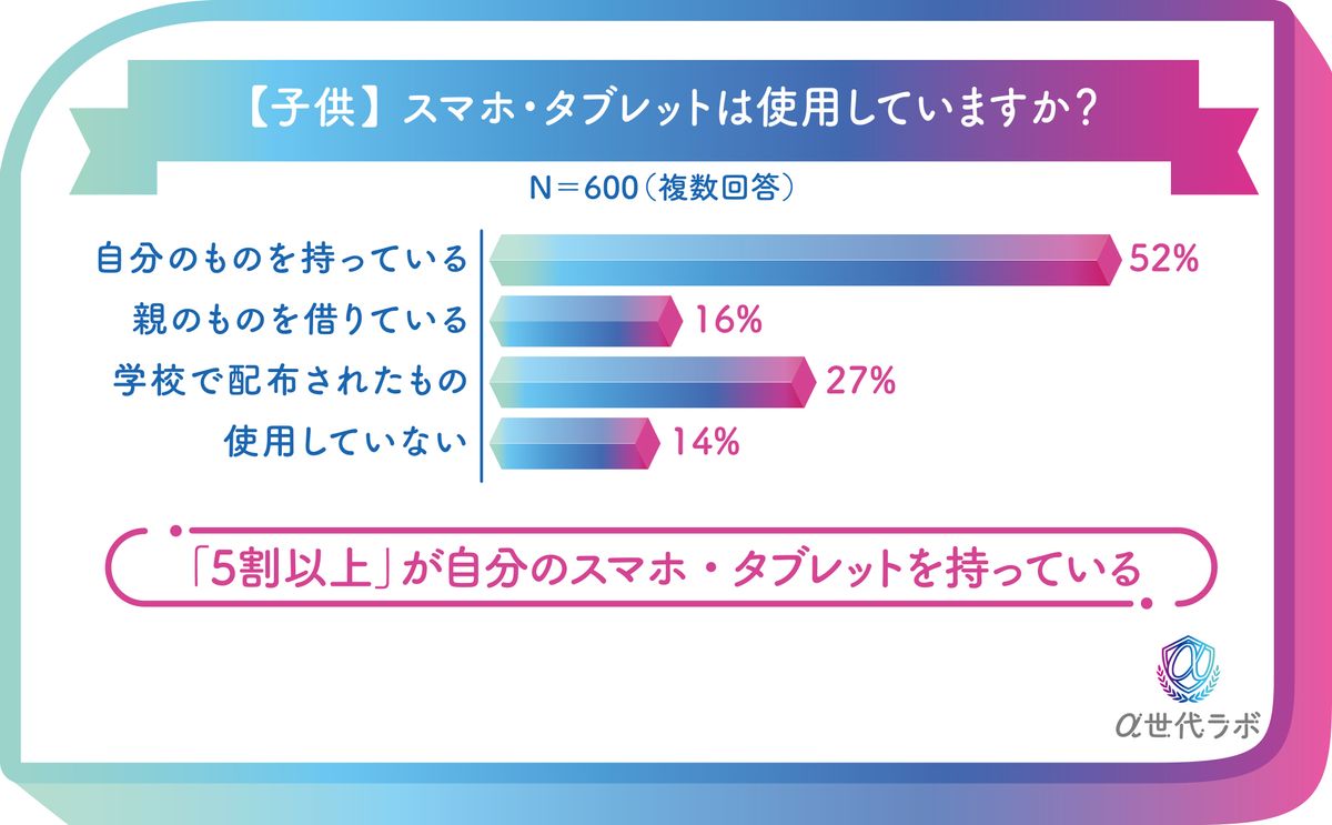 そうしたうえで、α世代のスマホ・タブレットの仕様状況として、「自分のものを持っている」と52%が回答。「学校で配布されたもの」が27%おり、「使用していない」はわずか14%にとどまった。