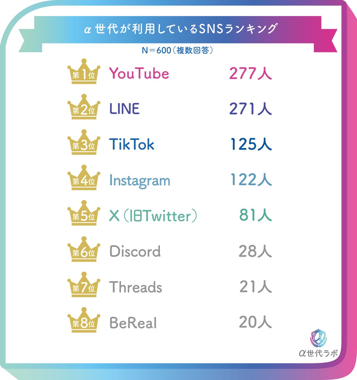 続いて、利用しているSNSは、「YouTube」が277人でトップ。「LINE」が271人と僅差で続いている。そこから若干離れて「TikTok」「Instagram」「X」となっている。LINEは家族や友人との連絡に使われ、YouTubeもエンタメや学習目的で活用されることが多いので上位を占めるのはわかるが、その次に「TikTok」「Instagram」といったZ世代にも人気なSNSが続いているところに、若い人たちは似た行動になることがわかる。