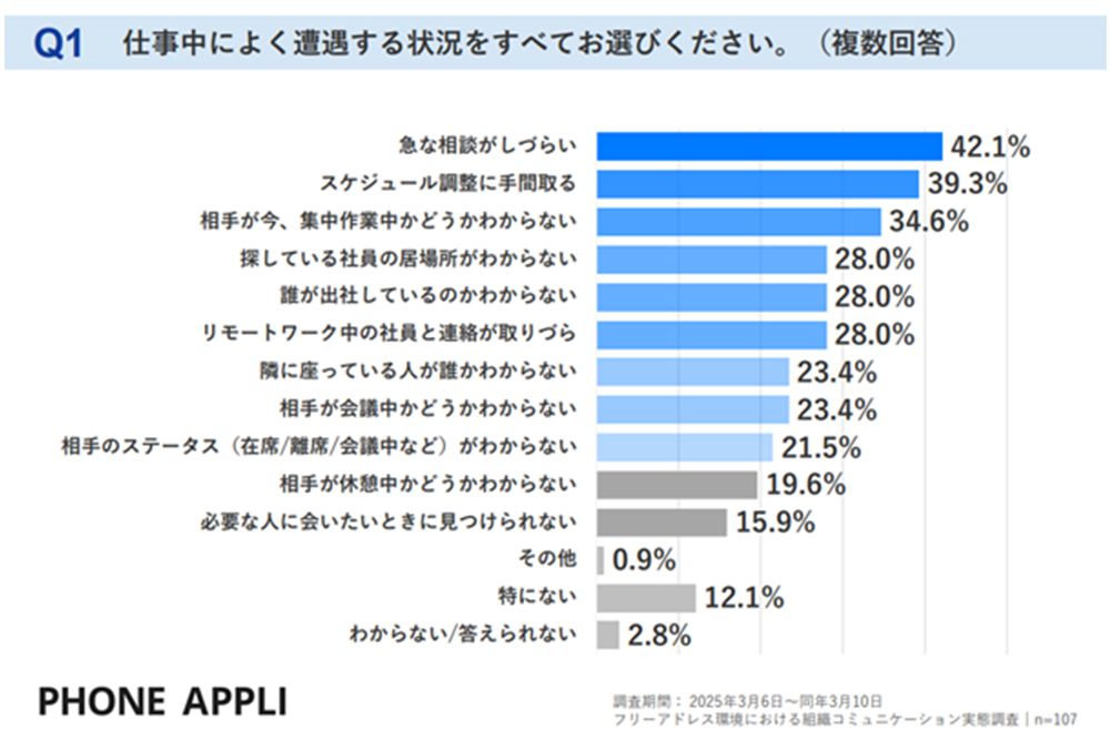 「仕事中によく遭遇する状況」としては、「急な相談がしづらい」、「スケジュール調整に手間どる」、「相手が今、集中作業中かどうかわからない」など、話したい相手がどこにいるのか、そもそも出社しているのかが把握し辛いことによるコミュニケーション上の問題があげられた。