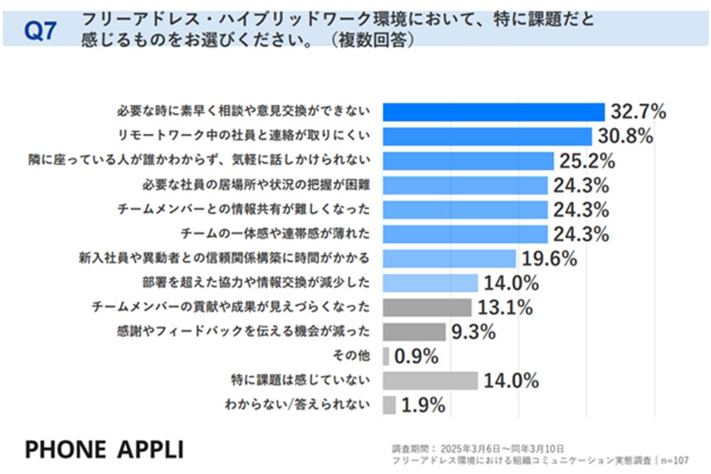 組織を強くするコミュニケーションポータル「PHONE APPLI PEOPLE」などを展開するPHONE APPLI(フォンアプリ)は、従業員1000名以上でフリーアドレスを導入している企業に勤める会社員107人を対象に「フリーアドレス環境における組織コミュニケーション実態調査」を実施した。すると、フリーアドレスのオフィスでは、コミュニケーションに関する不満が多く示された。