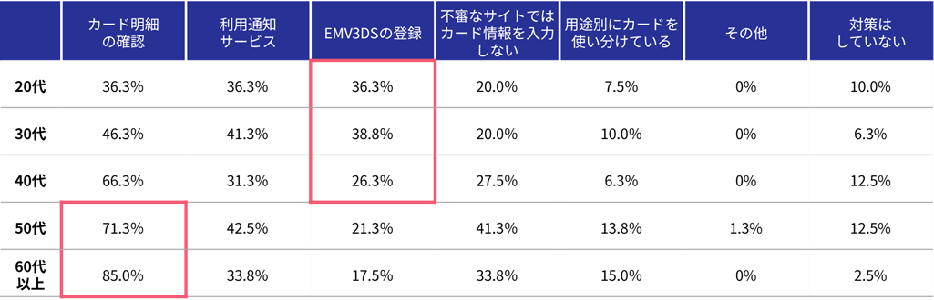 クレジットカードの不正利用対策として、もっとも多かったのは「カード明細のチェック」、次いで「利用通知サービスの登録」、「EMV3-Dセキュアの登録」だった。
