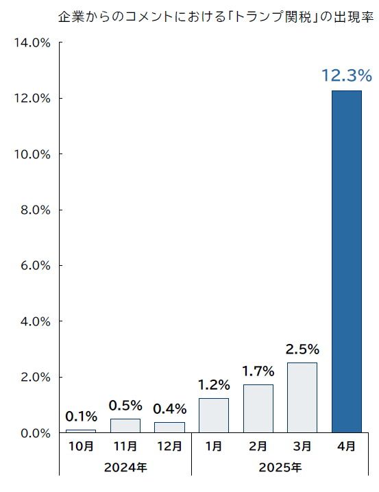 それによると、動向調査の回答者のコメントに「トランプ関税」に言及した割合を見てみると、2025年1月は1.2%だったが、徐々に増加し4月は12.3%と一気に増えた。