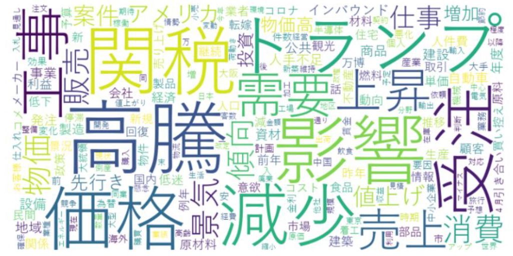 企業から寄せられたコメント内容も分析したところ、「高騰」「価格」「関税」「トランプ」といったワードが頻出している。