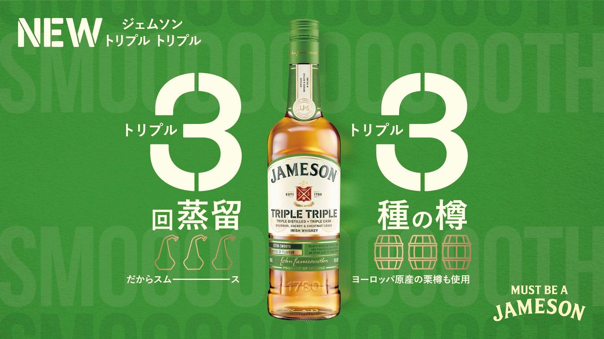 そのアイリッシュウイスキーの代表的銘柄「ジェムソン」から、新作「ジェムソン トリプル トリプル」が登場した。製品名の由来は、その蒸留と熟成の方法。アイリッシュ伝統の3回蒸留に加えて、バーボン樽、シェリー樽、栗樽という3種類の樽を使用した熟成を組み合わせたことが特長だ。