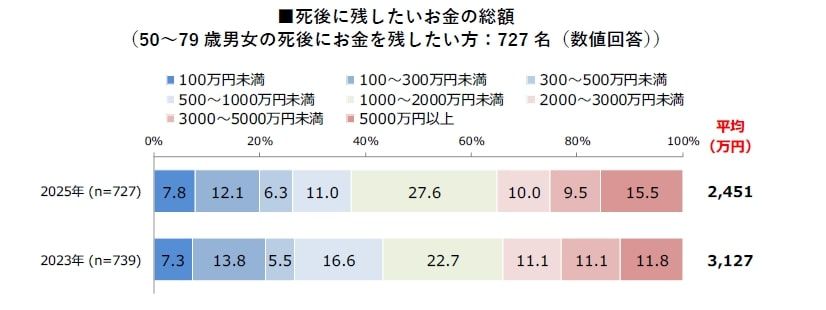 一方、終活にかかった平均費用は約503万円。前回調査の約450万円から増加しており、「資産運用の開始」「自宅のリフォーム」「不動産の整理・処分」など、生活の基盤を見直すための費用が多くを占めた。さらに「死後にお金を残したい」と考える人が想定する平均金額は約2451万円だった。