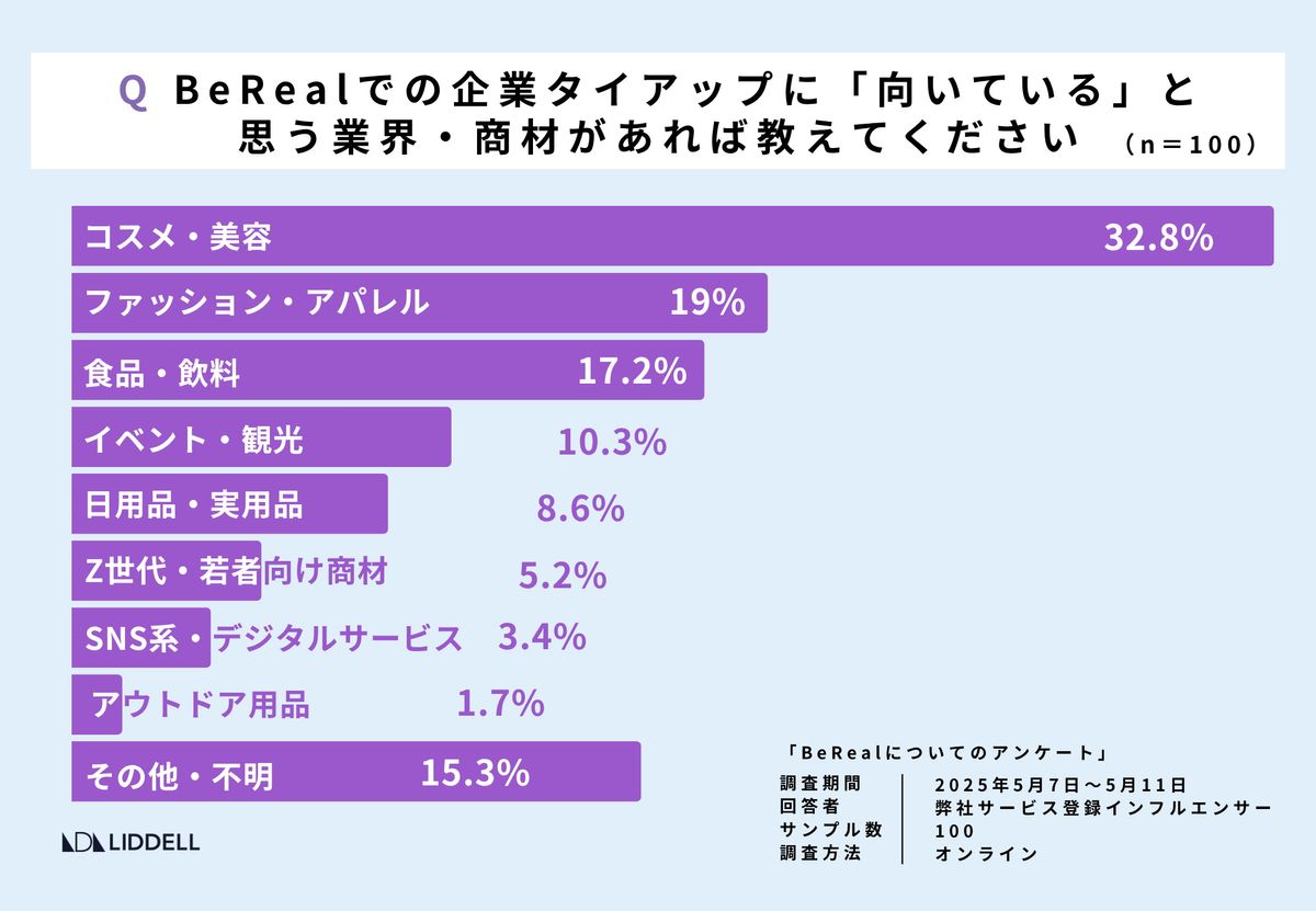 もしBeRealで企業タイアップとして向いているとしたら、の問いに「コスメ・美容」が32.8%でトップ、「ファッション・アパレル」が19%、「食品・飲料」が17.2%と続いている。