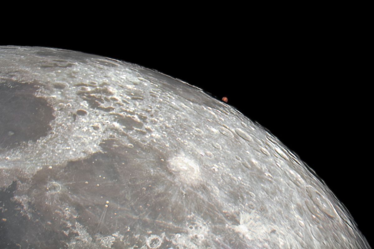 米アリゾナ州ツーソン郊外にある米国立科学財団(NSF)キットピーク国立天文台(KPNO)のビジターセンターに設置された最新望遠鏡で2025年1月13日に撮影された火星食(KPNO/NOIRLab/NSF/AURA/J. Winsky & A. Sorensen)
