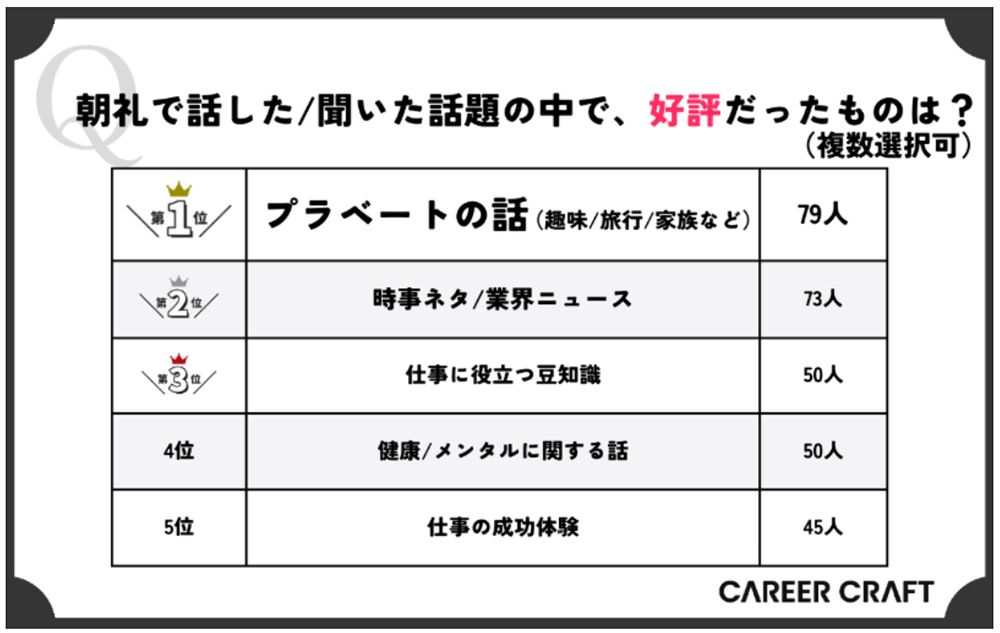 スピーチの内容は自由という企業が多いのだが、じつに約8割の人が何を話すかで悩んでいる。そこで調査では、朝礼で話して好評だった話と、不評だった話を尋ねた。好評だったのは趣味や旅行などの「プライベートの話」だった。「上司が飼っている猫の話。少しほっこりした」という意見が聞かれた。業務に直接関係はなくても、人間関係の潤滑剤としての役割がありそうだ。