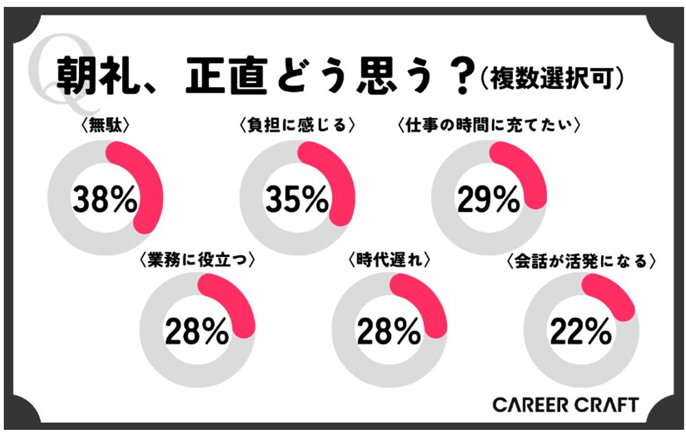 ところで、社員は朝礼自体をどう思っているのだろうか。アンケートでは、「無駄」、「負担に感じる」という意見が多かった。ただ完全に廃止すべきという人は約3割にとどまり、それなりに意義を感じている人が大半だ。残念ながら、スピーチに関しては、その内容ではなく、スピーチを強制されることに強い拒否感が見られた。なんらかの改善が見られるまでは、プライベートな話を面白可笑しく話すという路線で乗り切ろう。詳しい調査結果はこちら。