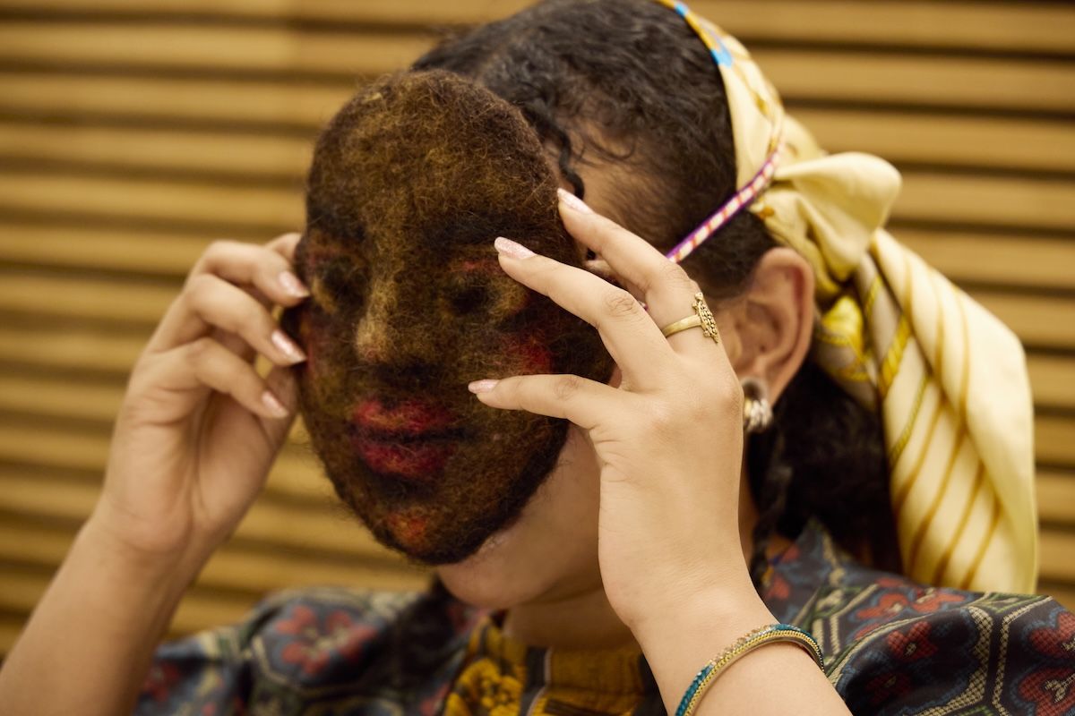 自分の髪の毛を貯めて、羊毛フェルトのようにチクチクして作ったお面です。この作り方はアフリカ系の人のドレッドロックスと近くて、直毛の髪の毛ではつくることができません。