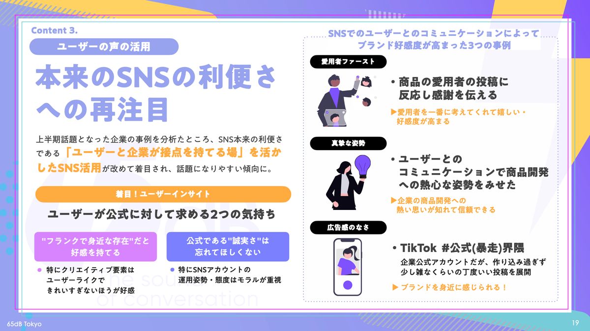 本調査の第3の注目点は、企業とユーザーとの接点におけるSNSの活用だ。調査では、企業がユーザーと直接つながる場としてSNSの「本来の利便性」に再注目が集まっていると述べられている。