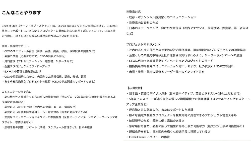 事務的なサポートはもちろん、投資家対応やプロジェクトマネジメントなど守備範囲は他の業種と比べて幅広い。Pathfinderの小野﨑CEOは社長室長や社長の右腕ではないと話しているが、オイシイファームでは「右腕」と表現。CoSの業務内容や位置付けは企業によって異なる。