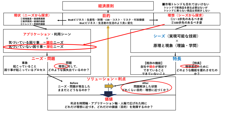 BtoCモデルやCtoCモデルでの目的は、生活者のより良い生活への変化や人生に感動を与えることになります。それをニーズから発見していく。ニーズの発見については、情報偏差と業界慣例とトレンド。この三つをきちんと探していくと潜在ニーズは見つかるはずです。