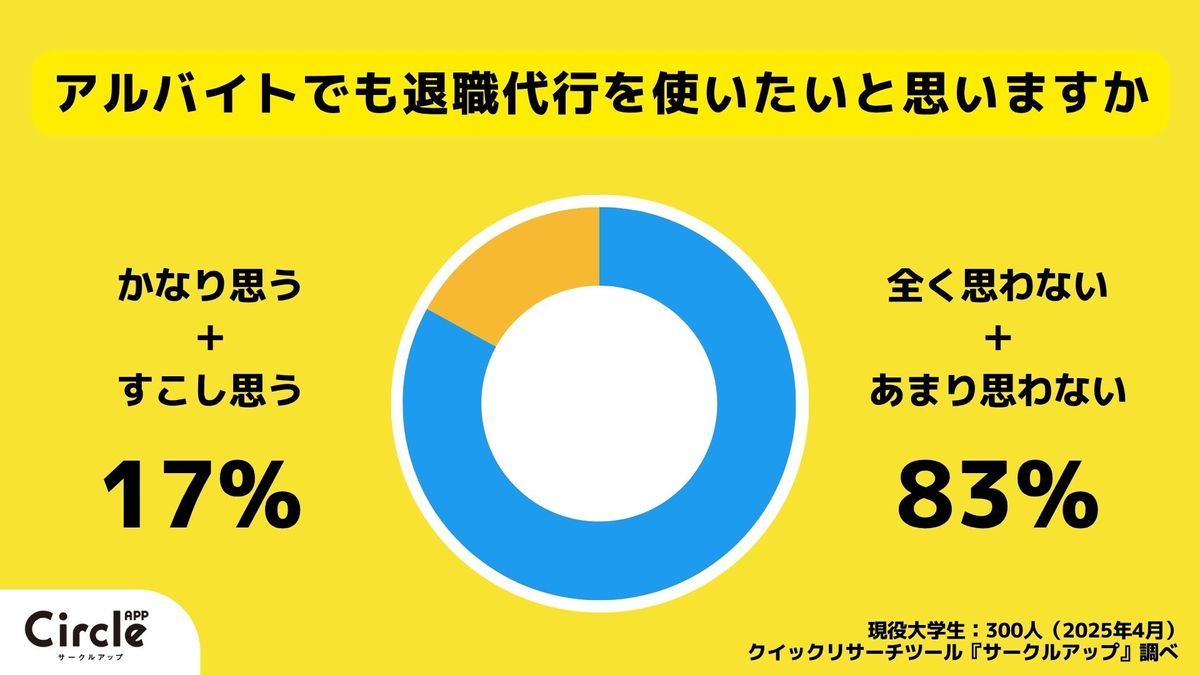 これらは、正社員の退職代行利用理由と共通する部分も多い。しかし、「アルバイトでも退職代行を使いたいか」という質問には83%が「使いたくない」と回答している。